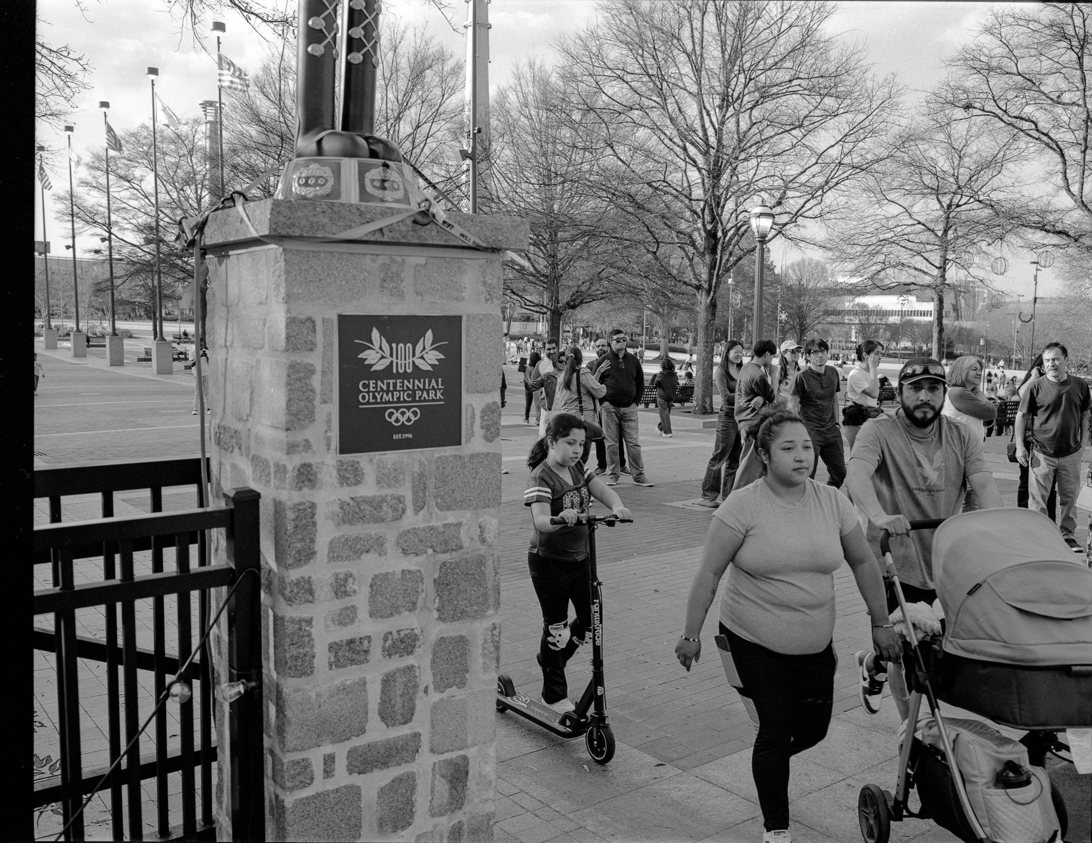 In this photograph, a child glides past on a scooter, a woman guides a stroller forward, tourists drift through the background like ambient sound. The Olympic marker anchors the frame as it always has, a monument to what this place was meant to signify. Nothing dramatic unfolds here. That is precisely the point. This is what downtown looks like most days — people simply moving through space, attending to their own trajectories. Three Atlantas occupying the same stretch of pavement for half a breath.